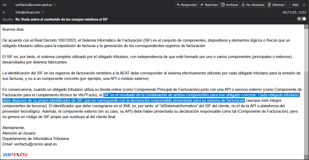 SIF (Sistema Informático de Facturación): Es el sistema completo que el Obligado Tributario utiliza para expedir facturas. Así lo define el Real Decreto 1007/2023.